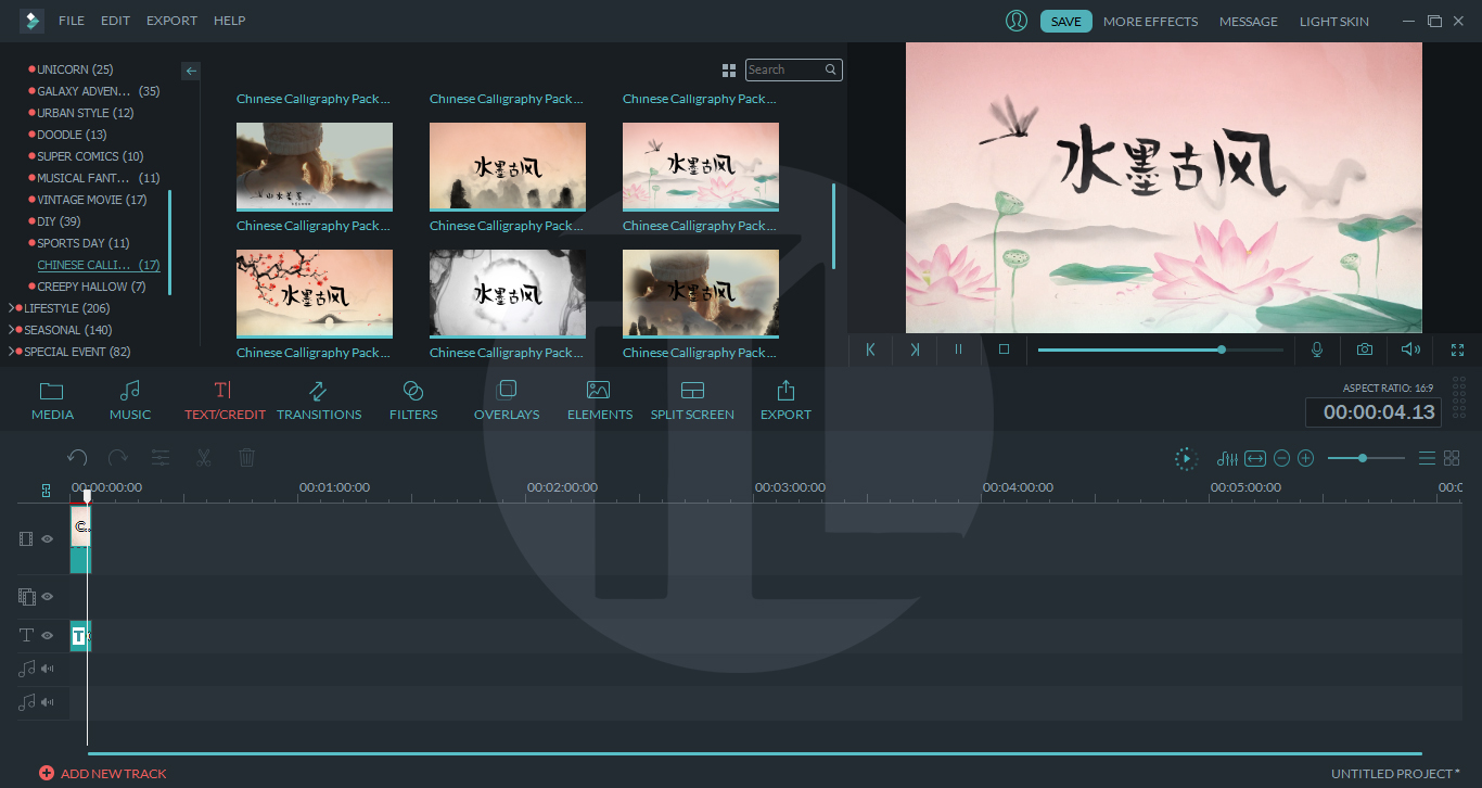 Wondershare Filmora Chinese Caligraphy Effect Pack October 19, 2018 Add Comment Contents on this Pack : Title (17) Transition (3) Overlay (11) Element (21) Screenshots : CHINESE CALIGRAPHY PACK Download: [GoogleDrive] *Note: Better works on Filmora v8.6.1 and later